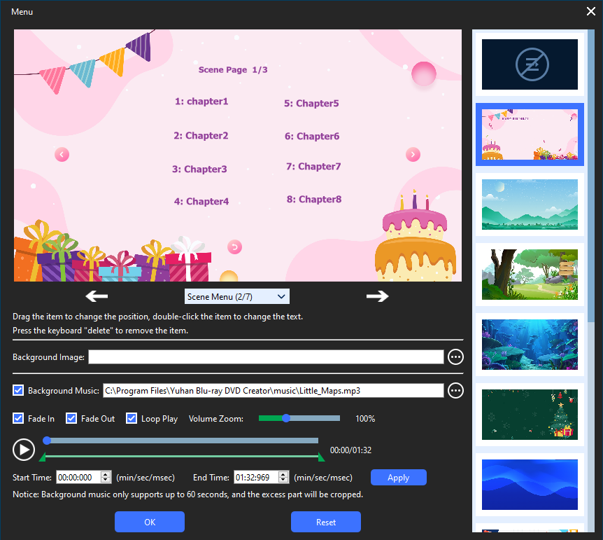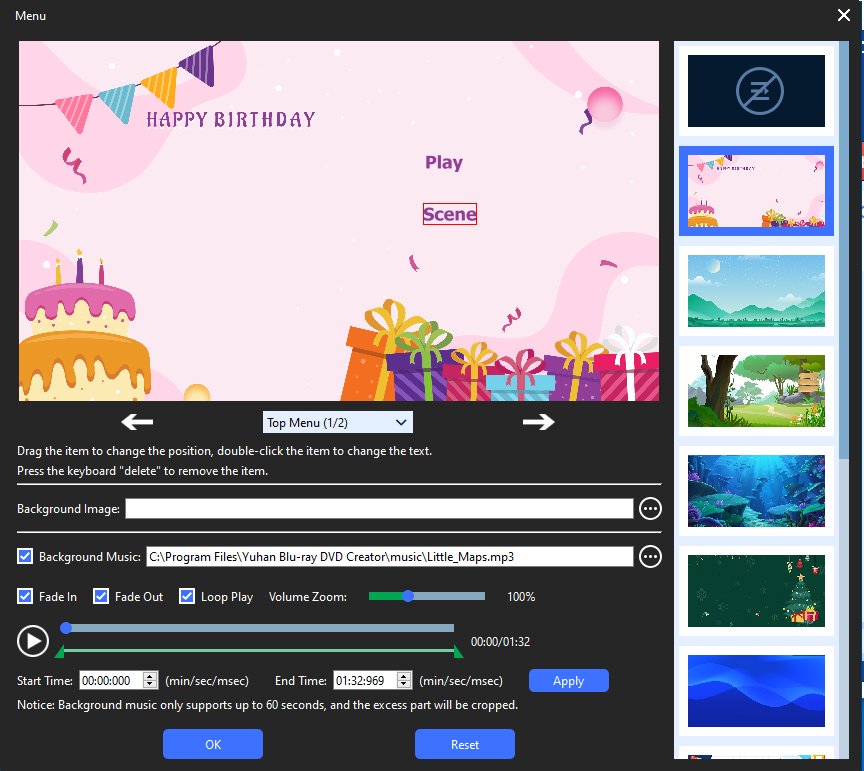 - Select Menu. Yuhan Blu-ray DVD Creator has more than 10 built-in menus, you can choose your favorite built-in menus, orcustomize the menus. Yuhan Blu-ray DVD Creator supports custom menu including: setting menu background picture, setting menu background music, modifying the position and content of menu items, deleting some menu items, etc.