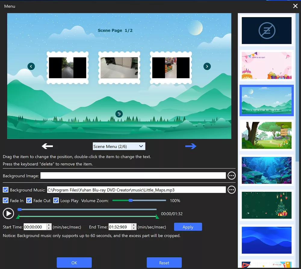 Yuhan Blu-ray DVD Creator is a versatile software that offers over 10 different menu styles to choose from, allowing you to pick the one that best fits your needs. The software supports two menu display methods – “Play Item Icon” and “Chapter List Text”. You can choose “Play Item Icon” to display the menu by media file or “Chapter List Text” to display the menu by chapter. - Customization is a strong suit of Yuhan Blu-ray DVD Creator, allowing you to create unique menus in various forms. You can set menu background pictures and choose different backgrounds for each page or use the same background for all submenus. You can even set background music and apply fade in and fade out music effects or crop the music to fit your preference.
