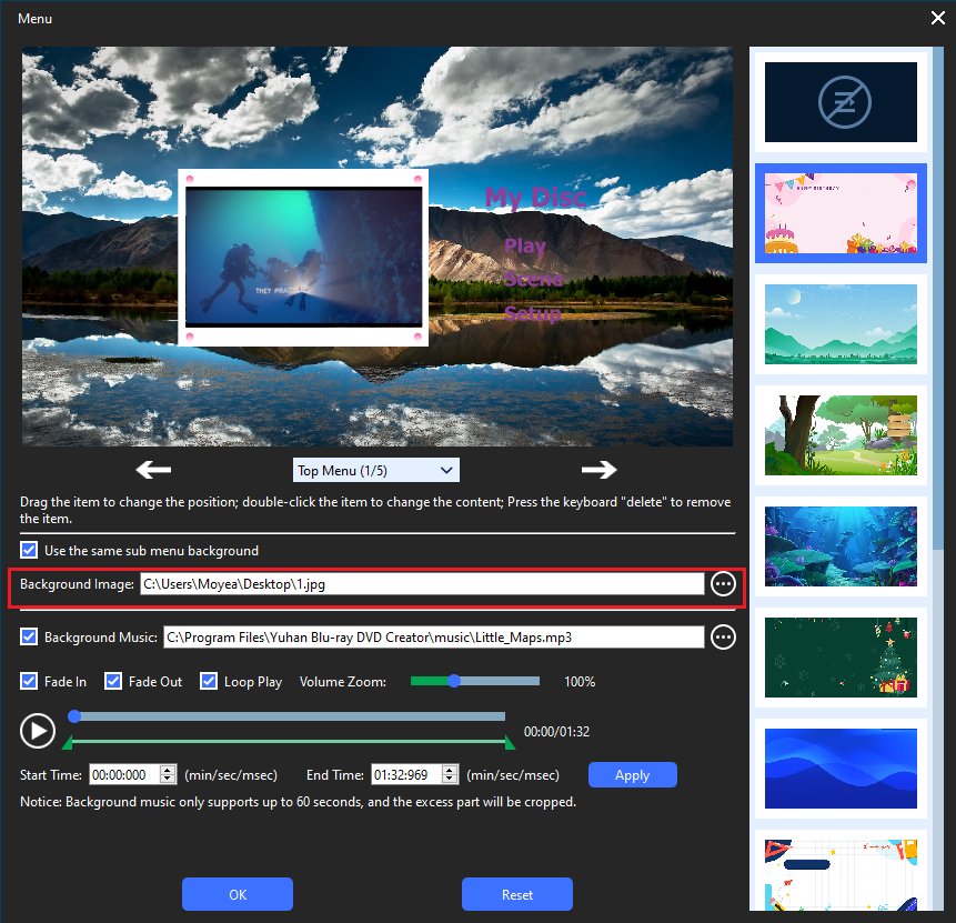 - Set background music. Yuhan Blu-ray DVD Creator menu offers a feature that allows you to add background music to your DVD. You can choose any music that you prefer as the background music, but please note that the maximum playing time is one minute. If the music exceeds this duration, it will be automatically intercepted.